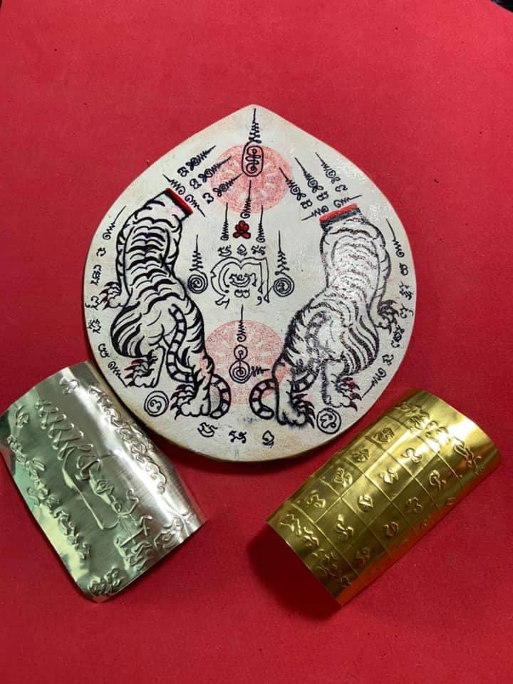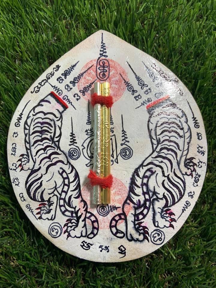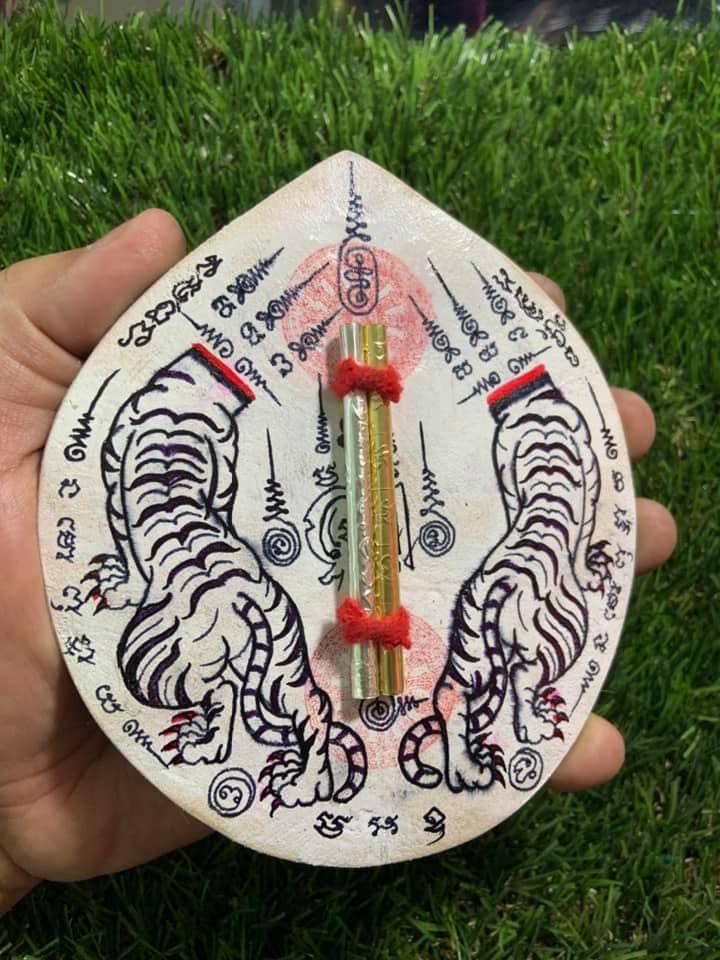 ĐƯỢC LÀM TỪ DA HỔ THẬT , MẶT SAU YỂM THÊM 2  CẶP HỔ KHÔNG ĐẦU , CHÍNH GIƯA ĐƯỢC YỂM THÊM 2 YANT PHÉP THẦY TỰ KHẮC VẼ CHÚ THÀNH TARKUT