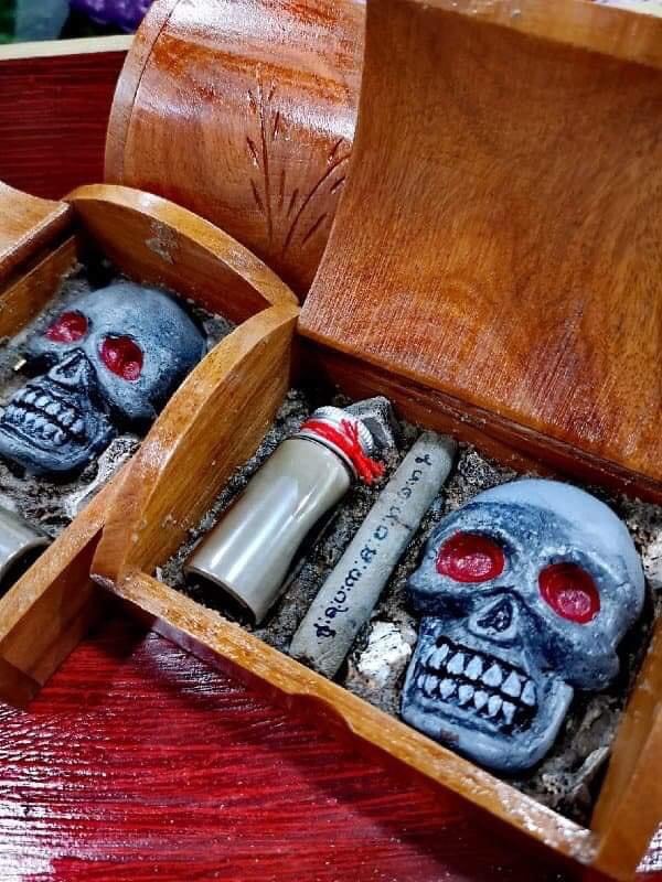 Hòm ma thiên linh cái được yểm 1 cốt bùa Prai Ksip mạnh mẽ. Tro xương và đất nghĩa trang, xương vụng từ những hài cốt chết ở nơi hoang vắng như rừng hoang, nhà hoang, sông suối trong rừng hoa giã nhiễn. 1 lọ sáp quỷ luyện từ ngải ma và mỡ người chết. 1 takrut phép đen cũng luyện từ tro xương người chết với các loại bột ngải trong rừng sâu.